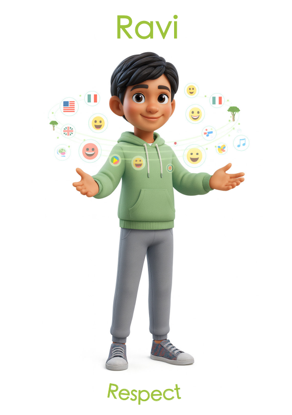 Ravi is a natural role model because he is calm, accepting, and patient. He shows deep consideration for others' backgrounds. He teaches us that true respect is about thoughtful listening and never interrupting. Ravi reminds us that we are all different, and that's exactly what makes us interesting and special.
